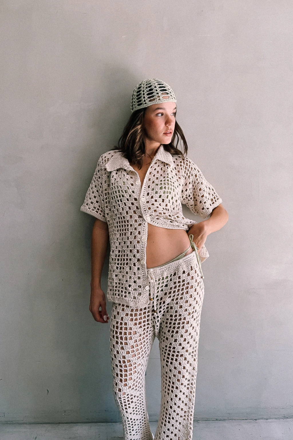Camisa tejida a mano en 100% algodón, con diseño de crochet de punto cuadrado calado. De corte relajado, manga corta y cuello clásico, ideal para usar como prenda principal o sobre otras capas. Con botones del mismo tono del tejido.