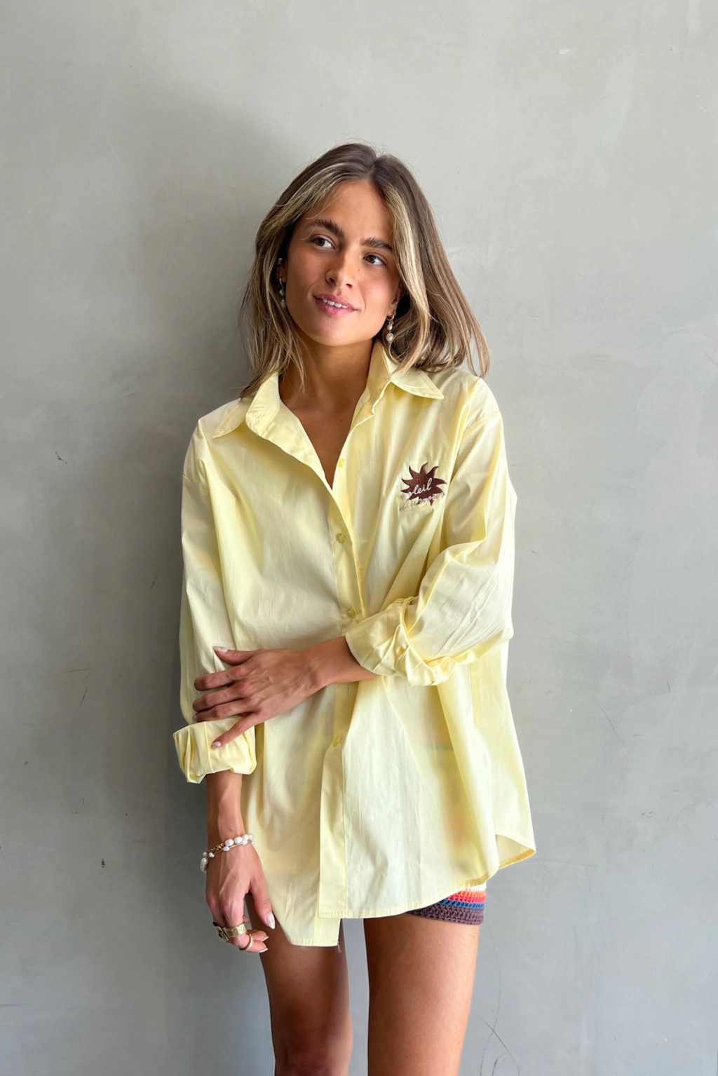 Camisa de vestir oversize. Botones al frente y un pequeño sol bordado en el lado izquierdo. Esta confeccionada en poplin, ofrece una textura suave y fresca, ideal para mantenerte cómoda en climas cálidos sin perder el estilo. Una prenda versátil que eleva cualquier conjunto con su sencillez y elegancia natural.