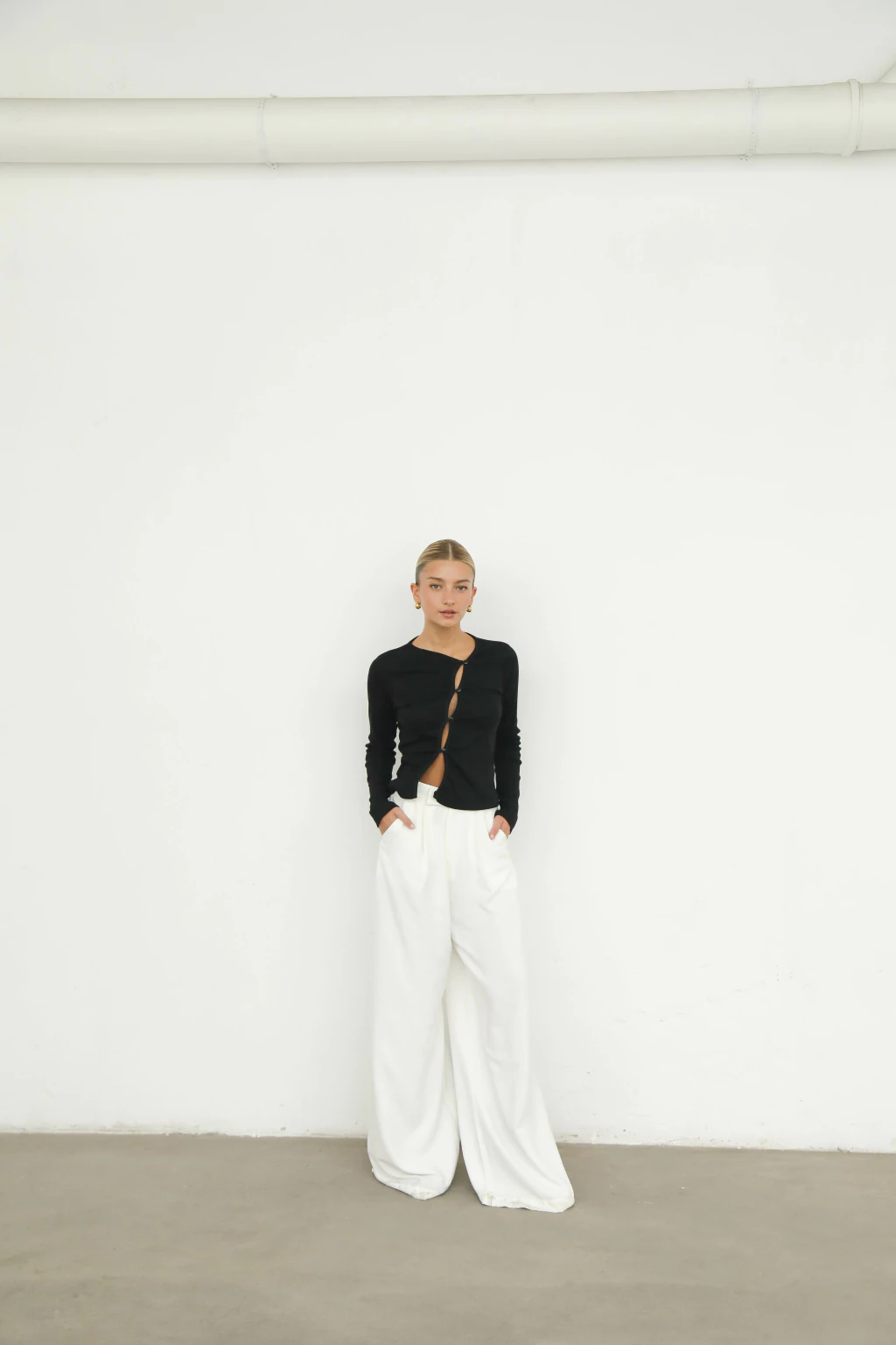 Elegancia y sofisticación se combinan en este pantalón de tiro alto confeccionado en twill premium, una tela sastrera liviana que aporta una caída pesada y un movimiento fluido. Su corte recto con pinzas y pata ancha resalta la silueta con un estilo clásico y moderno a la vez.