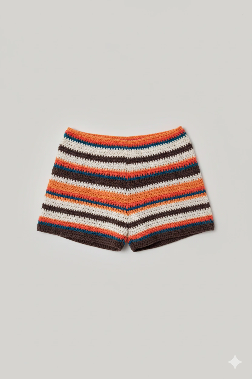 Short tejido a mano con hilado 100% de algodón, presenta un diseño a rayas con colores vibrantes que combinan tonos chocolate, naranja, natural y azul. Su textura suave y fresca brinda una gran comodidad, mientras que su estilo versátil permite usarlo tanto en looks casuales como en conjuntos más cuidados.